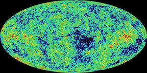 The figure shows a detailed, all-sky picture of the infant universe created from nine years of WMAP data. The different colours in this picture show that the Universe 300 000 years after the Big Bang was not the same everywhere. The colour differences indicate temperature fluctuations that correspond to the seeds that grew to become the galaxies. Source: NASA/WMAP