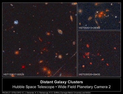 This image shows that the light of far-away galaxies is red instead of yellow because they are moving away from us. Source: ESA/NASA