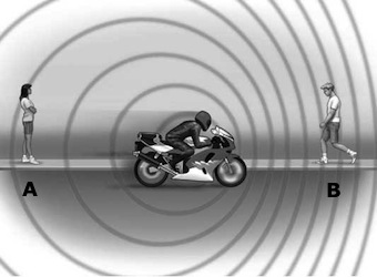 The Doppler Effect applies to all types of waves but it’s easiest to explain using sound. Imagine a motorcycle moving towards an observer B. Its engine is emitting sound waves (noise) in all directions but, as the motorcycle travels forward, it’s catching up with the sound waves it released earlier, meaning that the gap between each successive wave front gets smaller. This increases the frequency of the sound waves which means B hears a higher pitched noise. Behind the motorbike, the effect is inverse, with the spacing between wave fronts getting bigger as the motorcycle moves away from observer A, who hears a lower pitched noise.
