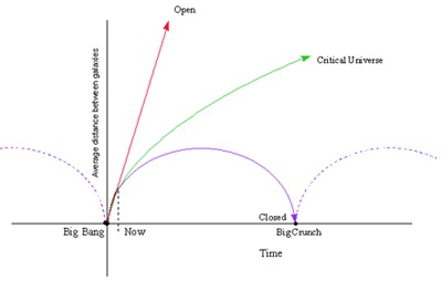 2. If the density of the Universe is high, then the Universe will expand for a while but slow down as it goes until it reaches a maximum size. Then gravity will pull everything back in again until the Universe collapses back into the singularity it started with in what we call The Big Crunch. This is called a Closed Universe, as it has a finite size and can lead to another Big Bang producing a new Universe.