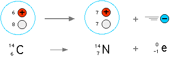 Carbon (meaning all three isotopes) is absorbed by living organisms, and continuously replenished during their life cycle. However, when an organism dies, this process stops. The unstable 14C decays into 14N via beta decay (electron emission), and the 14C content decreases exponentially with time. By measuring how much 14C is left undecayed at a given moment in time, one can work out how long ago the organism has died.
