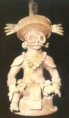 Right: ceramic figurine of the king Yax K’ uk Mo depicted with Teotihuacano trappings (Copyright American Institute of Physics 2004).