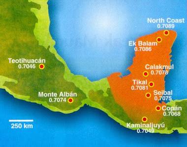 Left: measurements of the ratio 87Sr / 86Sr for various pre-Colombian cities in Mexico and Yucatan peninsula (Copyright American Institute of Physics 2004).