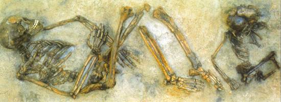 Left: pottery dated by thermoluminescence to be 7,000 to 10,000 years old. Image courtesy of A. Chênè (CNRS Photothèque). Below: Skeletons of a woman and of a child dated by thermoluminescence to be 92,000 years old. Image courtesy of CEA – CNRS – CFR.