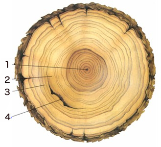Three rings variations: 1 - first year of growth, 2 - rainy season (thiker ring), 3 - dry season (narrower ring), and 4 - a scar from a forest fire.