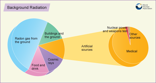 As the figure above illustrates, nuclear waste contributes with only a small proportion to the background radiation. For instance, all radioactive waste accumulated until the year 2000, allowed for cooling for 500 years, will show an activity equivalent to the natural radioactivity of 30x30x2km slice of soil (2 kilometres is the typical depth of an underground waste repository).