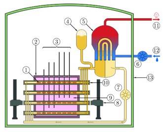 Schematic of a CANDU reactor: 1 - fuel bundle, 2 - reactor core, 3 - control rods, 4 - D2O pressure tank, 5 - steam generator, 6 - water pump, 7 - D2O pump, 8 - fueling servos, 9 - D2O moderator, 10 - pressure tube, 11 - steam to turbine, 12 - cold water from turbine, 13 - containment building (Image credits: Creative Commons)