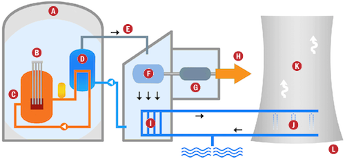 Legend: (A) containment structure, (B) control rods, (C) reactor vessel, (D) steam generator, (E) steam line, (F) steam turbine, (G) generator, (H) electricity to consumers, (I) condensor, (J) spray, (K) water vapour, (L) cooling tower.