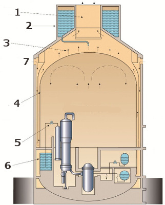 The image illustrates passive safety devices: 1 - natural convection air discharge, 2 - gravity drained water tank, 3 - water film evaporation, 4 - steel containment vessel, 5 - automatic depressurization valve, 6 - gravity-fed refueling water tank, 7 - cooling with outside air (Image credits: Westinghouse 2011). During a power blackout, emergency water is channeled into the reactor core by gravity, and re-circulated through passive convection and condensation.
