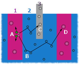 A reactor which runs on thermal neutrons is called thermal reactor. The diagram on the right shows the main components (1-3) of and processes (A-D) in a thermal reactor: (1) fuel rod, (2) moderator, (3) control rod, (A) fission, (B) moderation, (C) absorption in control rod, (D) capture in fissile material.