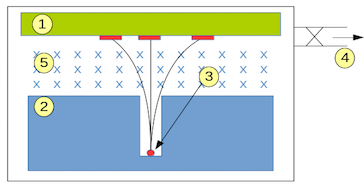 Schematic of Becquerel's setup: (1) photographic plate, (2) collimator, (3) radioactive material, (4) vacuum pump intake, (5) magnetic field. Image credits: Zoltán Elekes.