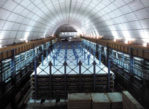 The image on the right shows a neutrino detector situated 1.4 km below the top of a mountain, in Italy.
