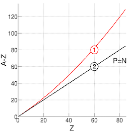You may think that the more neutrons a nucleus has, the more stable it should be after what we have just discussed. However, this is not the case. Nuclei are only stable for a specific range of ratios of neutrons to protons, about 1-1.6. Outside these ratios, the nucleus will be unstable and decay. For example, nitrogen is stable and has a ratio of 1: it has 7 neutrons and 7 protons. On the other side of the range, lead, which is also stable, has 82 protons and 126 neutrons, with a ratio of 1.54. A graph showing the region of stability according to numbers of protons and neutrons is shown below, where Z is the number of protons in a nucleus, N is the number of neutrons, A=Z+N is the number of nucleons, and the two curves correspond to (1) stable nuclei, (2) P=N line. Graph credits: Zoltán Elekes.