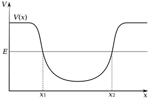 As we have said, alpha decay acts to decrease mass, however it is only feasible when binding energy per nucleon is not at a minimum, so for elements with nuclei heavier than nickel, however, it has only actually been observed for the most massive nuclei of element tellurium and above. Alpha decay is an example of a process called ‘quantum tunnelling’. The nucleus of an atom creates a well of potential energy, as shown in the diagram, which traps the alpha particle that already exists inside the nucleus.
